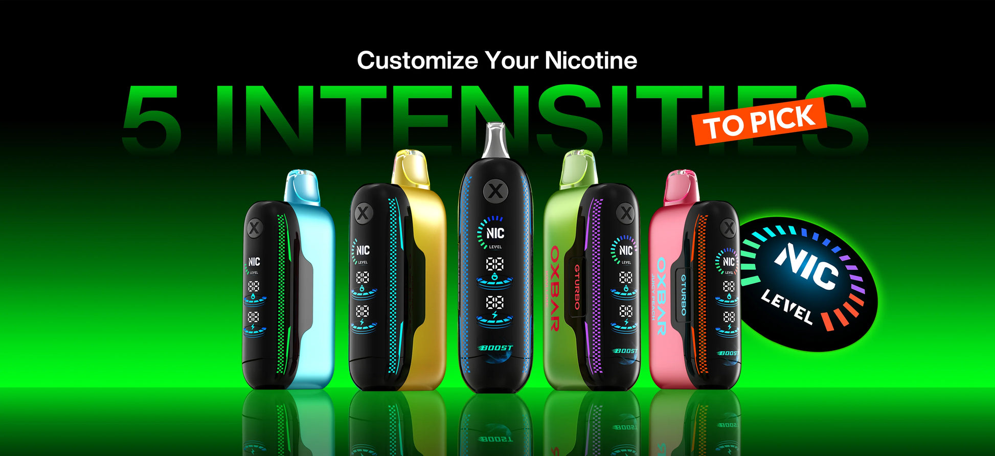 Oxbar gturbo is a versatile disposable vape with 5 nicotine levels for customized flavor.